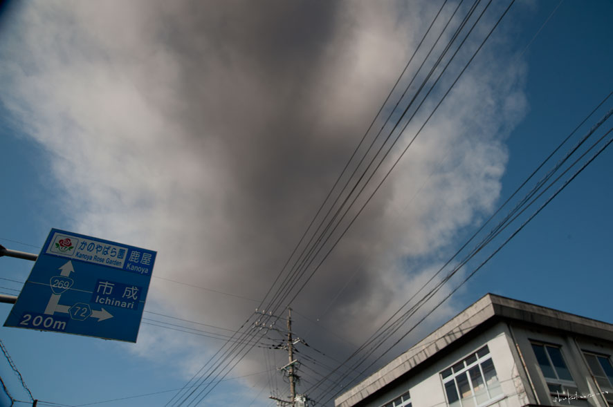火山灰の下を走る。 都城市10号線から、269号線に入って、鹿屋市まで向かう道を通っていたら、 黙々とあがる火山の雲を遠く向こうに見え、 「わ〜!桜島は、遠い、あそこの方面やっちゃ!」と、思っていたら、 火山灰の雲も、ゆっくり、こっちに広がって流れてきて、わたしもその下に待ち合わせした状況になり、 運転中に、見上げた景色に、カメラひっぱりだし、カシャっとしました。 鹿屋市札元一丁目交差点まで、あと、約15分ほど。 2月10日、日曜日。AM10:45の出来事。 Share: Twitter Facebook Google+