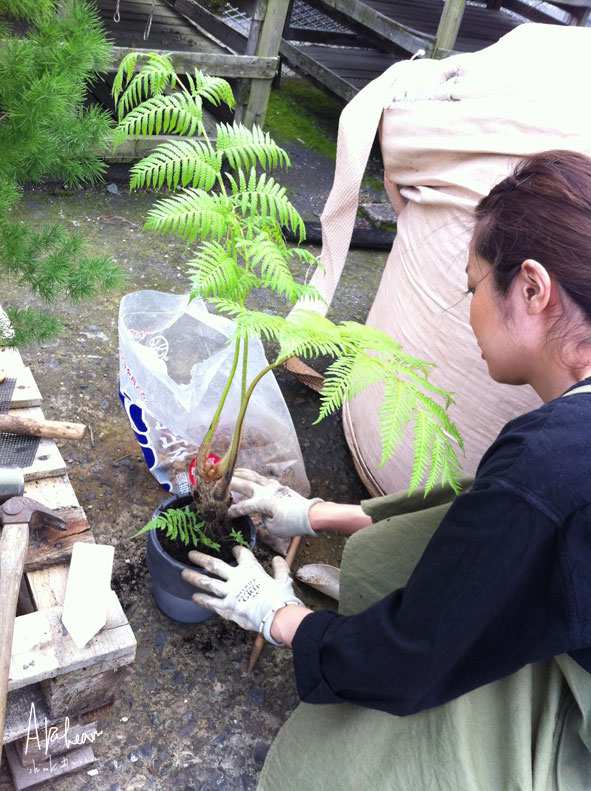 植物の「ヘゴ」は、しおりちゃんに、別の鉢に植え替えてもらい。。。