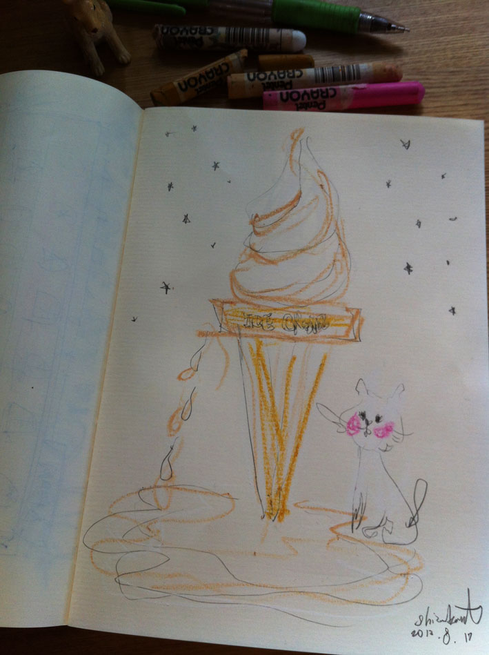 はじまりの絵 あ、ソフトクリームのカップに 『SOFT CREAM (ソフトクリーム)』と描きたかったのに、 『ICE CREAM(アイスクリーム)』と描いてしまいました。 今、こうやって、写真をUPしてから、UPしながら、気付きました。 (((今朝のスタートの絵を、なぜ、ソフトクリームにしたか、私も、わかりません。))) 朝やから、ぼ〜っとしてますね。 午前、8時30分。 今朝は、涼しいです。 Share: Twitter Facebook Google+