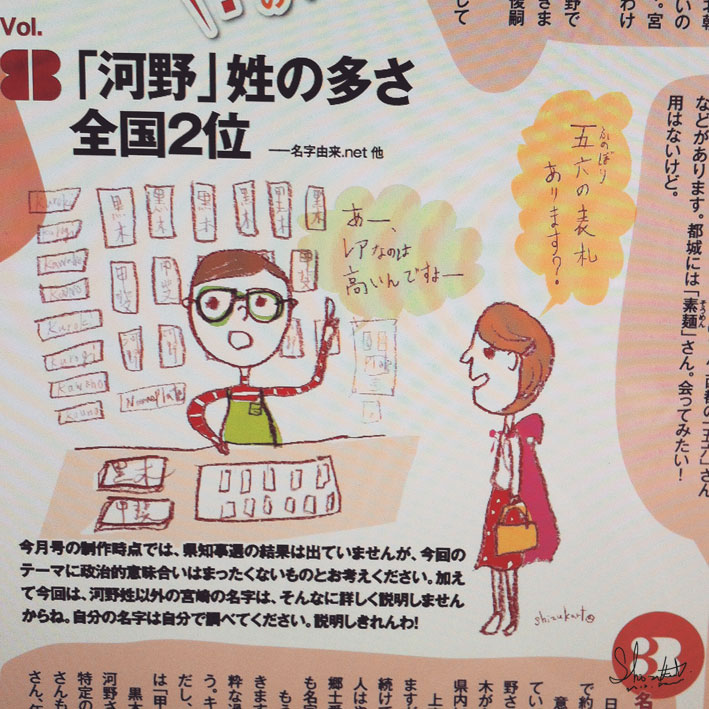 1月号のコラムのイラストは、 1月号のコラムのイラストは、このように~♪ vol.8「ミヤザキよんじゅうななぶんの2位!~「河野」姓の多さ全国2位~」 今年もお世話になりました。来年もどうぞ、宜しくお願い致します。 Design : See Designing Illustration : shizukart® Palms 2015/1 No.278 (((ご依頼いただきありがとうございます!))) Share: Twitter Facebook Google+