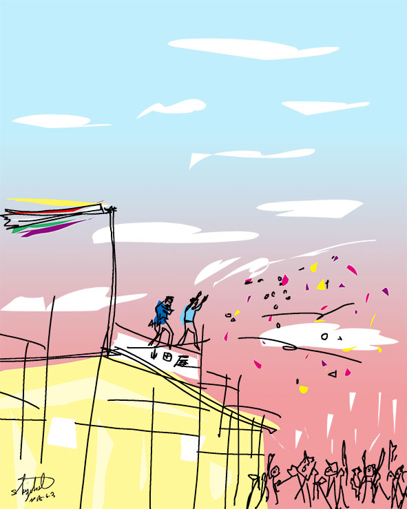 せんぐまき 小さい頃は、新しく家がたちはじめるところを見かけると せんぐまき(棟上げ)が、そろそろありそうだな〜〜〜。と、子供ながらに察知し、 ある日 吹き流しが鯉のぼりのように泳ぎだす風景を見つける。 妹とせんぐまきのある家に走っていく。 今は、せんぐまきの光景をあんまり見かけない。 私が大人になったからか? 2018年6月3日(日)大安 いい「せんぐまき」に行ってきた。 私は、何も拾わなかったけど、楽しかった。 「せんぐまき」の光景っていいな〜。 Share: Twitter Facebook Google+