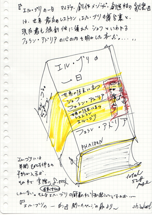 エル・ブリの一日 エル・ブリの一日 レストラン『エル・ブリ』の一日を528ページに渡ってつづる とても分厚い一冊。 一日のはじまりから、スタッフの様子や、メニューのこと。 お客さまのこと。写真をまじえて、たくさん、たくさん綴っている。 COOKCOOPで以前見て、 1ヶ月ほど経ち、やっぱり、欲しいと思ったので、自分のモノにした。 この本をみていると、料理の本ながらも、 クリエイティブも大事。お客さまへの真心も大事。仕事場の掃除も大事。 と改めて教えてくれる。 Share: Twitter Facebook Google+
