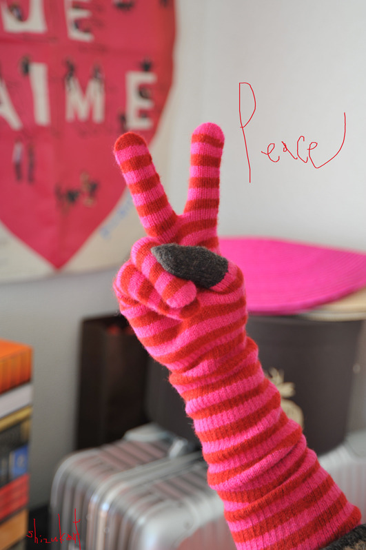 PEACE 2009年12月31日 今年最後の写真は、今日、shizukartの作業場に ヘルプにきてくれました、 わたしの妹に、手袋をつけてもらい、 来年の願いを込めて “PEACE”サイン。 Share: Twitter Facebook Google+