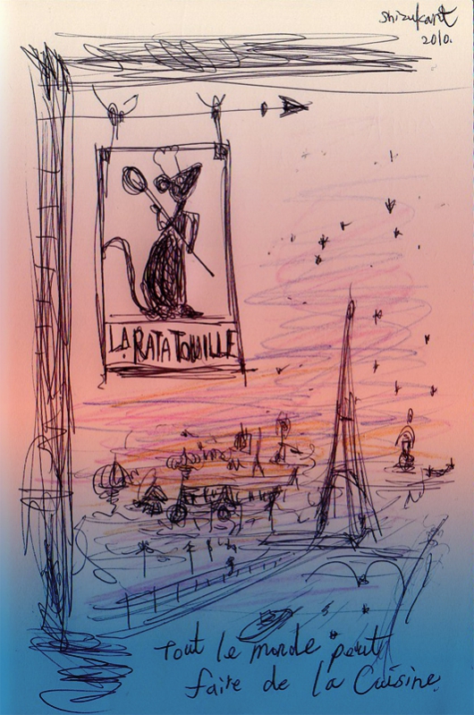 映画『レミーのおいしいレストラン』Ratatouille 映画『レミーのおいしいレストラン』原題(Ratatouille) 先週の料理の味はわすれられません。 ということで、 「レミーのおいしいレストラン」の一番すきなシーンを描きました。 Share: Twitter Facebook Google+