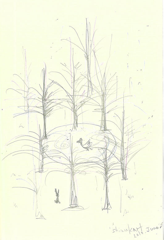 待合室の中で。 今月は、待合室にて、順番待ちをしている時間が多く、 いつも、どうやって、時間をつぶそうか、 “ひとりあそび”を発見する時間でもあるのですが、 その中のひとつに、 “なんにも考えずに目的をもたずに、ただ、紙に鉛筆を走らせる” というあそび。 今日の絵は、これでした。 雨が降っていて、ジメジメしているので、 どこかの山の中でジメジメまっている気分の絵。 Share: Twitter Facebook Google+
