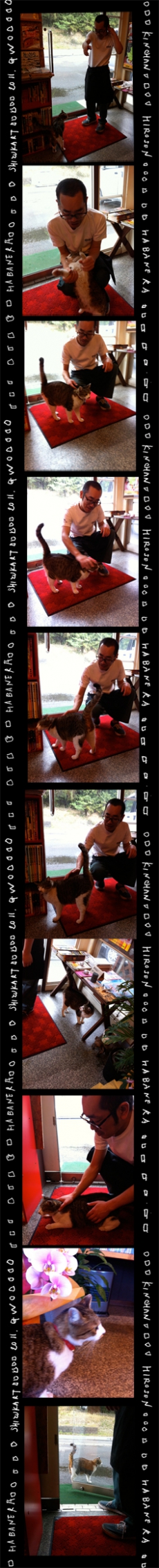 きんちゃんとひろせん 本郷の佐川さんへ商品を受け取りにいって、 ちょっとヒロセンのハバネラに行ってみたら 開店前だったのですが、 小雨の中、 ドアの前を猫がちら〜っちら〜っと 往復して、店の中の様子を伺っていました。 隣のお店の「きんちゃん」だそうです。 お店が始まる気配を感じると 出て行きました。 かわいいです。 ☆一番上の写真は、ヒロセンが きんちゃんに 「きんちゃん、カメラ、あっち。あっち見らんね〜。」と 言ってるところです。 Share: Twitter Facebook Google+