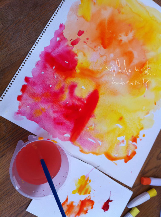 ぺんてる「あか×だいだいいろ×きいろ」 午後の誘いに間に合うように、 今日の朝は、 筆に水をたっぷり含ませた絵の具で 塗ったくって、 筆を叩いて点々をつけて にじませたり。 ぺんてる「あか×だいだいいろ×きいろ」 Share: Twitter Facebook Google+