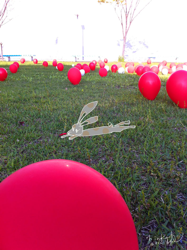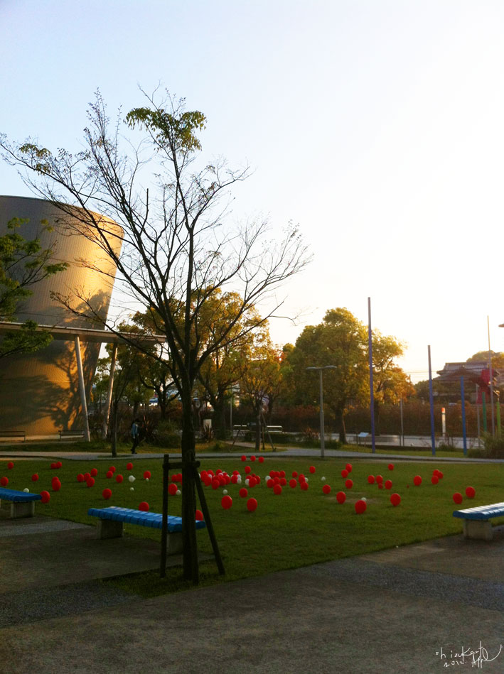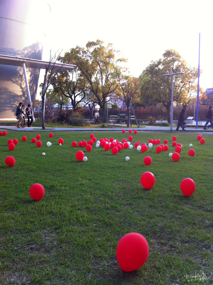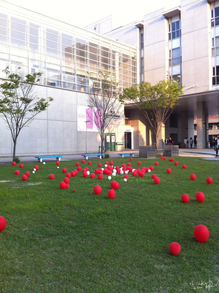 芸術学部の中庭には、こうやって、風船がたくさん、