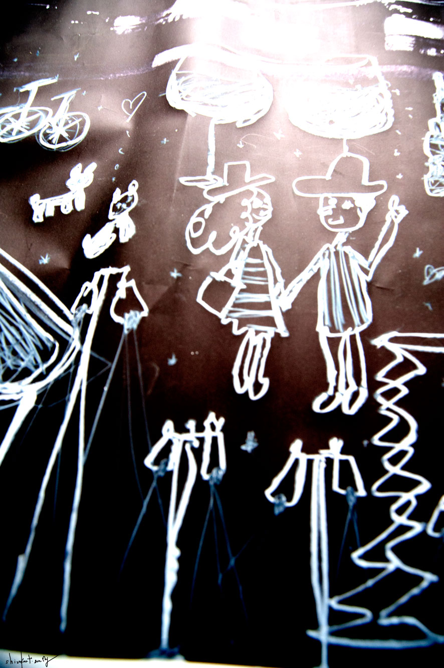 白いダーマトグラフとパステルで描く。