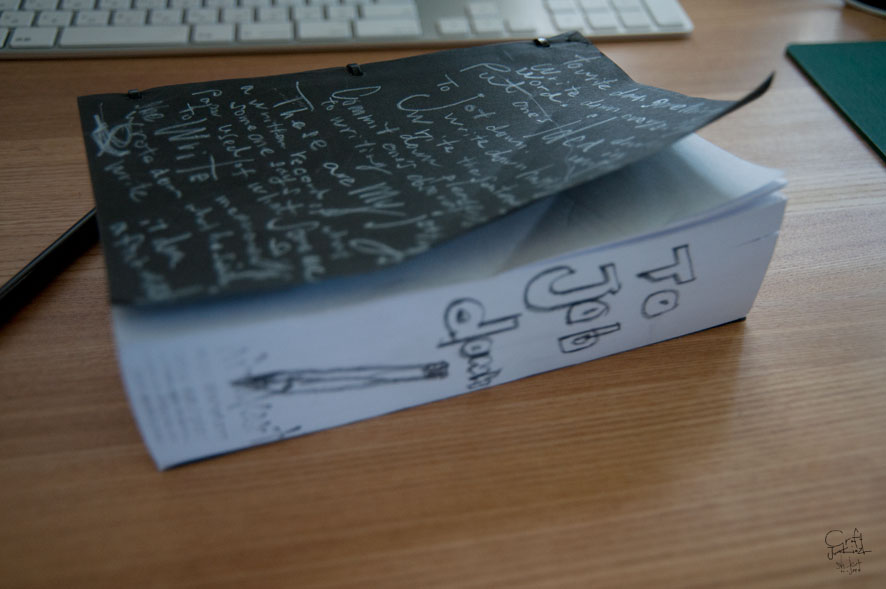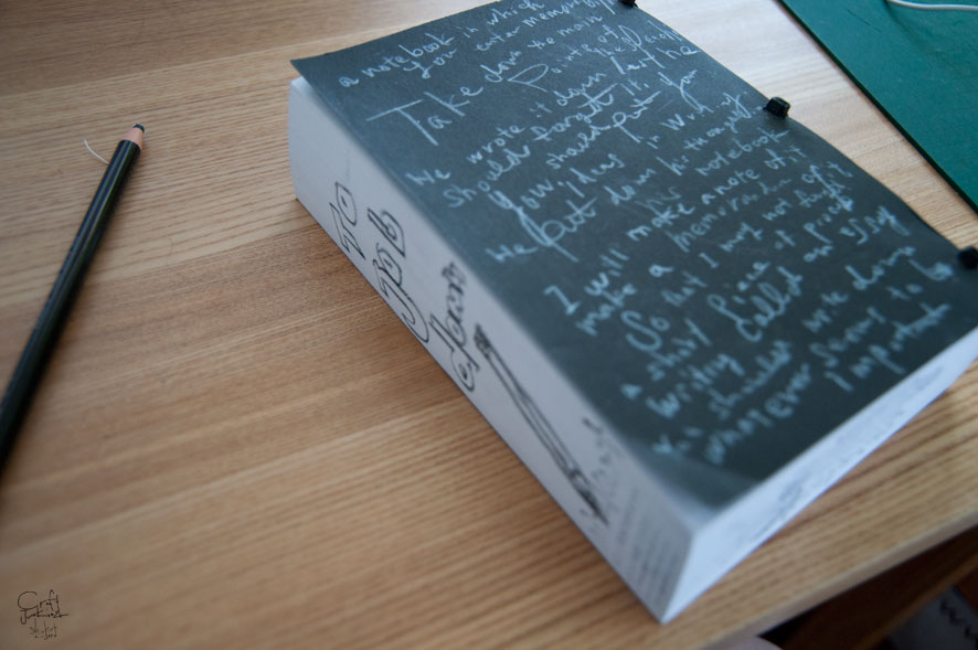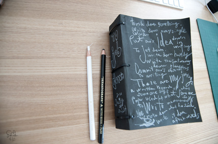 表紙と裏表紙と背の部分に、白色と黒色のダーマトグラフで文字をかきこみました。