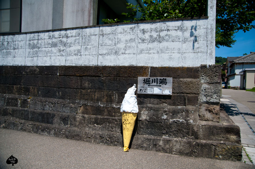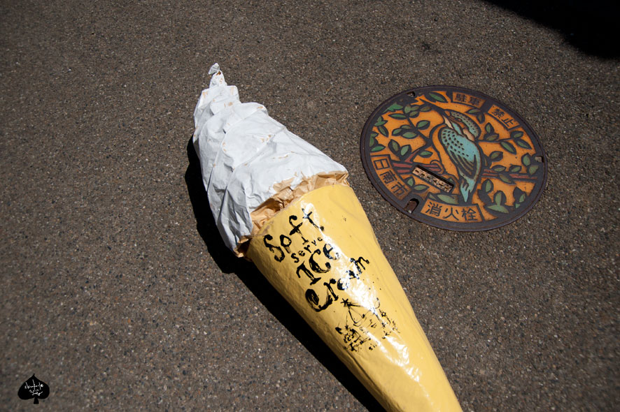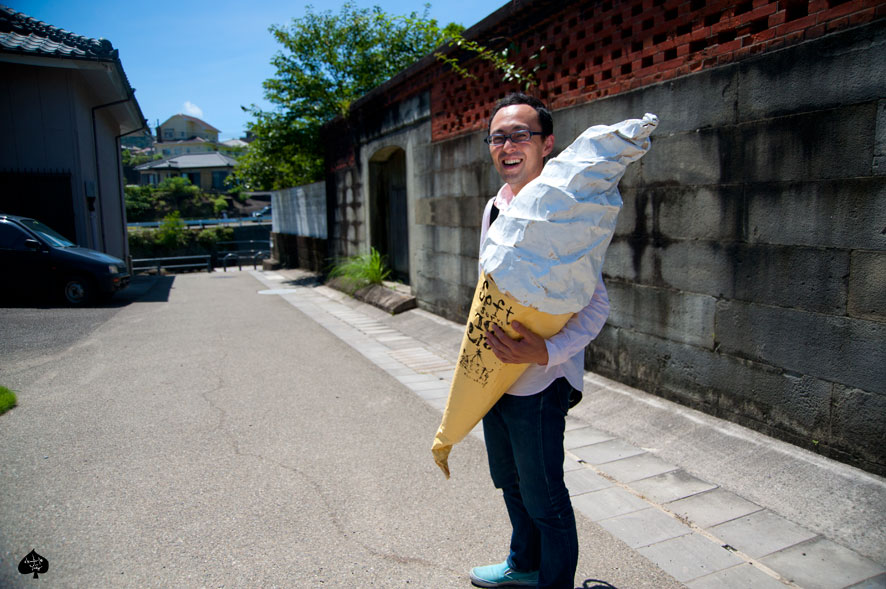 大きいソフトクリームのオブジェをIKEAの袋からはみだして入れて、迎えをまちに、道路にたって、