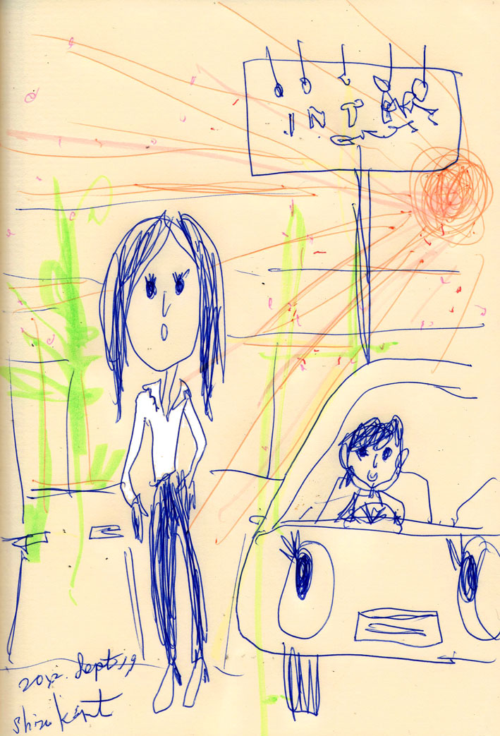 ブルーのボールペン ★いただいた絵本のブルーインクの線をみてたら、わたしも、ブルーで描きたくなったので、今朝は、ブルーボールペンを握りました。 ★今朝のイラスト日記は、 昨日、向かった先で、会えるだろうなぁ。と、思ってた、“ お久しぶりですね〜 ”の、友達さんと、あえた絵です。 ☆それでは、いってきます〜。 Share: Twitter Facebook Google+