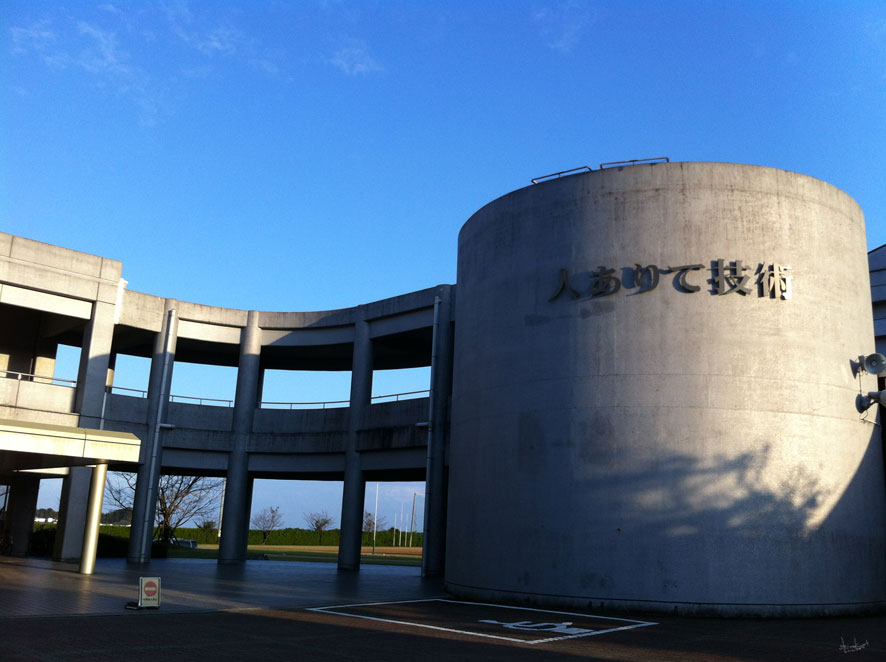 体育館横の円形のたてものに、『人ありて技術』の文字が、ど〜〜〜ンと、設置されていました。