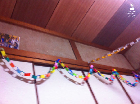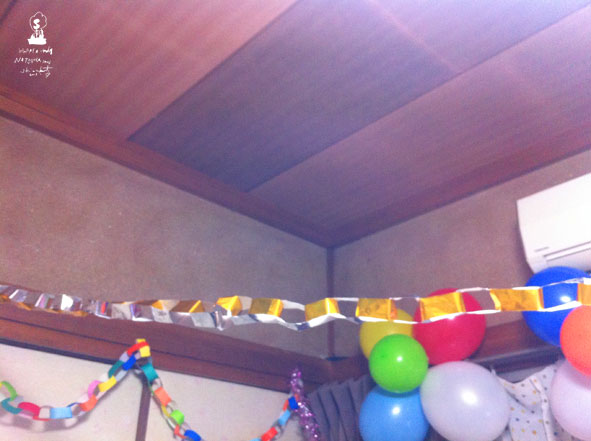 わたしは、約束時間より、だいぶおくれて、家についたのですが、誕生日のご本人さんは、飾りつけの、輪っかを、折り紙をハサミで切ったりしたり、